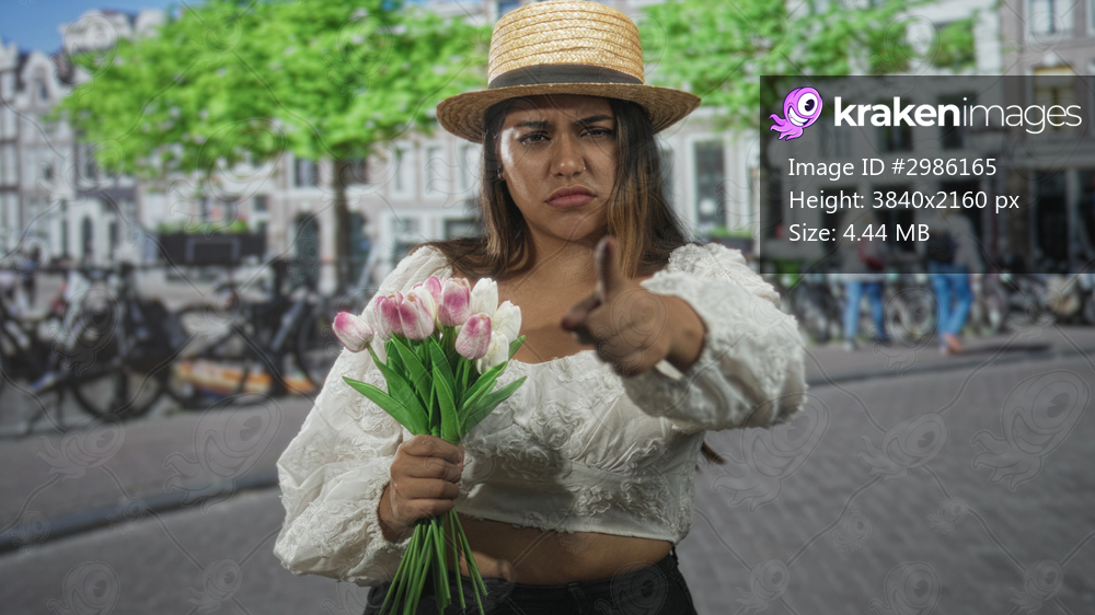 Woman holding pink tulips with one hand and other on hip exposing midriff on cobbled street by bicycles and buildings; annoyance defiance.
