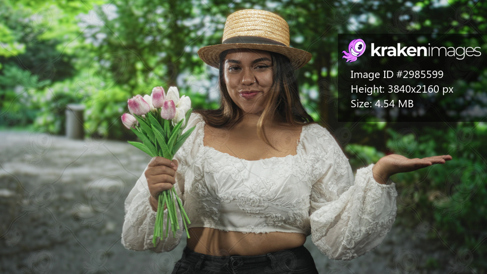 Woman holding pink tulips with open palm gesture showing bare hand and visible midriff, wearing a straw hat on a forest path; carefree joy.