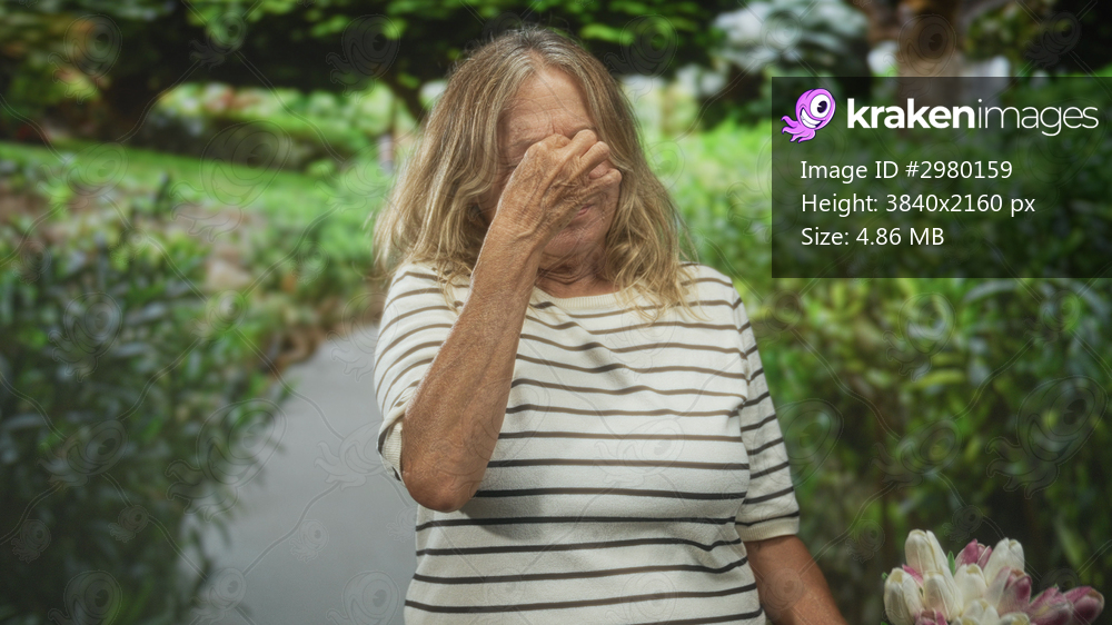 Woman holding pink tulips pinches nose on park path while closing eyes and lifting hand to cover face; disgust.