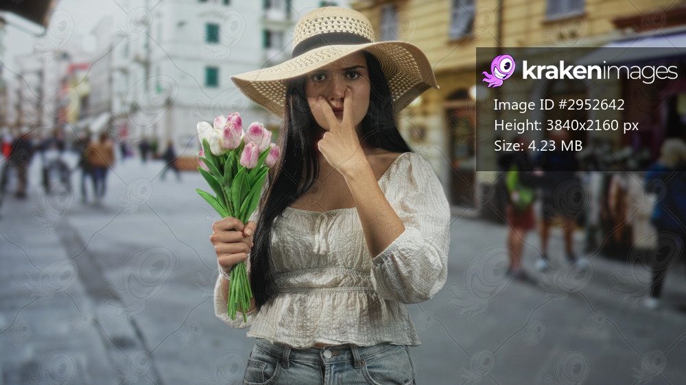 Woman holding pink tulips and pointing finger at camera on a crowded european cobbled street with shopfronts; confidence.