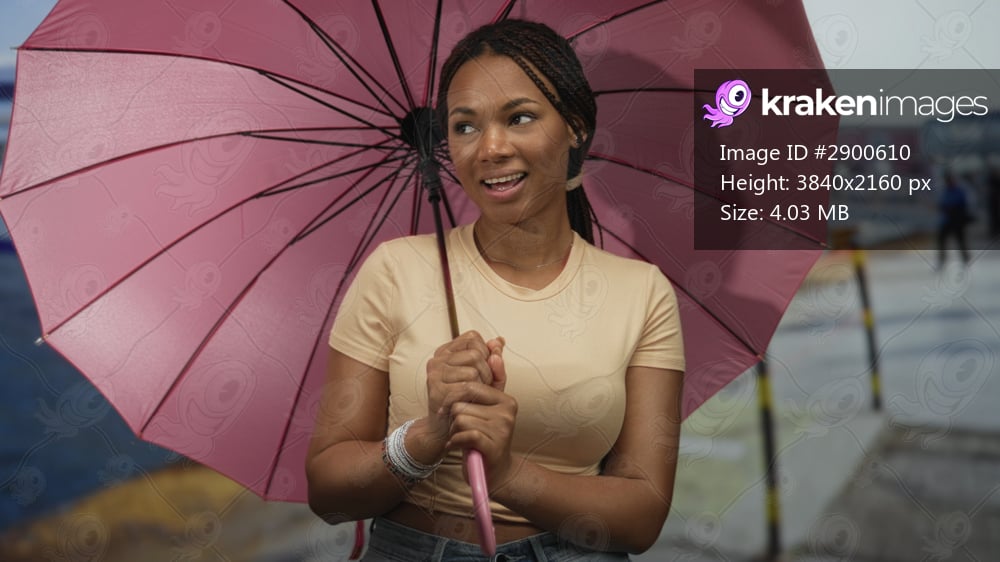 Woman holding pink umbrella and clasping hands on street at a port with boats and seaside pier; serenity coastal leisure.