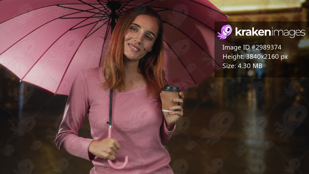 Woman holding pink umbrella and coffee cup, hand visible, standing on wet street at night; warm evening serenity.