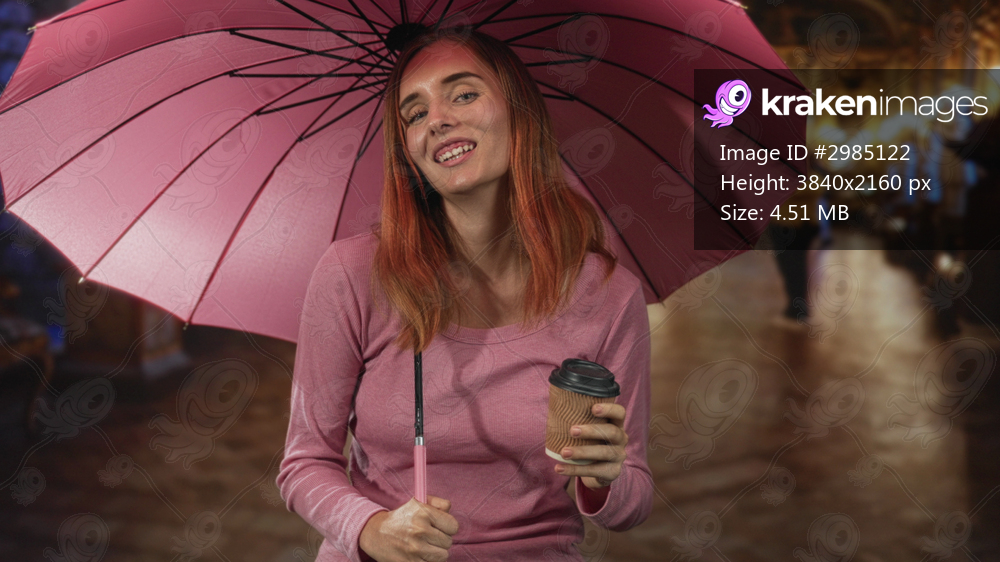 Woman holding pink umbrella and coffee cup on a city street at night, smiling and sipping a takeaway drink; urban joy.