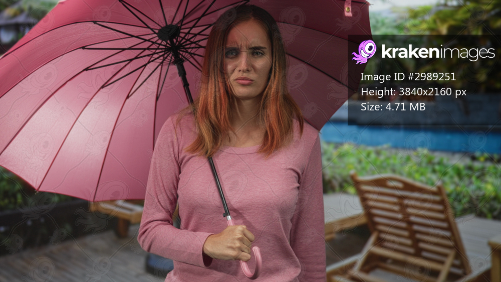 Woman holding pink umbrella, gripping handle and frowning by pool chairs at building pool deck; annoyance solitude.