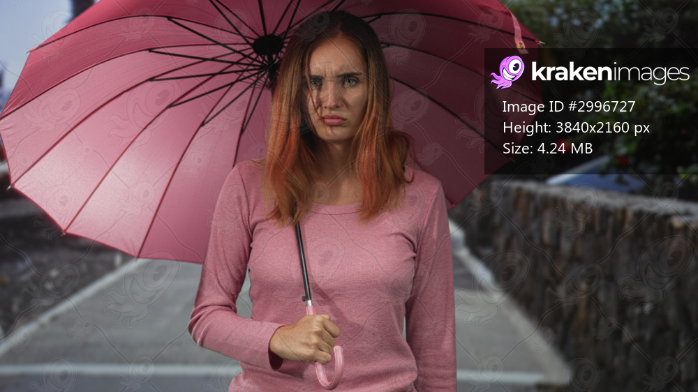Woman holding pink umbrella on street, gripping handle with one hand and frowning, red hair framing face; annoyance.