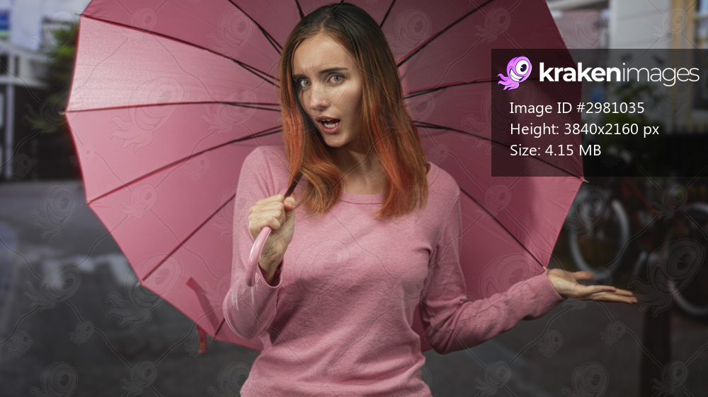 Woman holding pink umbrella with palm up and shrugging hand on urban street near bicycles and storefronts, wearing pink sweater; confusion questioning. - Kraken Images