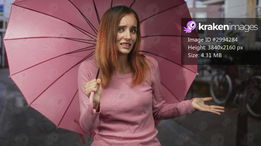 Woman holding pink umbrella with palm up and shrugging hand on urban street near bicycles and storefronts, wearing pink sweater; confusion questioning. - Kraken Images