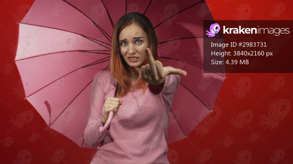 Woman holding pink umbrella shows middle finger in studio red backdrop, gripping handle and pointing with hand; defiance confrontation.