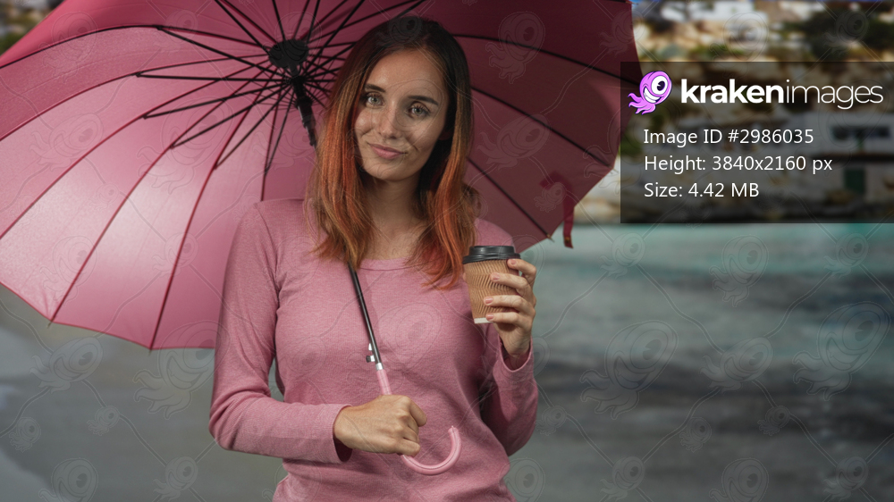 Woman holding pink umbrella and takeaway coffee cup, gripping curved handle with one hand, wearing pink sweater in studio by seaside backdrop; calm contentment. - Kraken Images