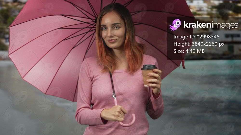 Woman holding pink umbrella and takeaway coffee cup, gripping curved handle with one hand, wearing pink sweater in studio by seaside backdrop; calm contentment. - Kraken Images
