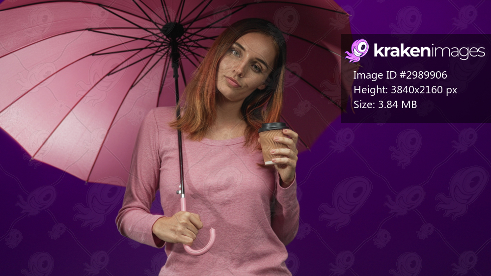 Woman holding pink umbrella and takeaway coffee cup, hand holding cup visible, wearing pink sweater in studio with purple backdrop; contemplation.