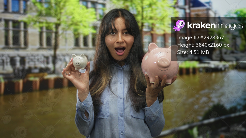 Woman holding pink and white piggybank on street in amsterdam city canal scene; savings choice surprise.