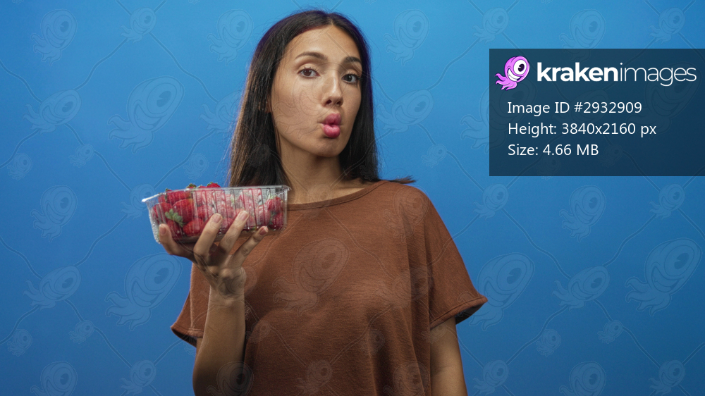 Woman holding plastic container of strawberries with puckered lips gesture in blue studio; playful appetite.