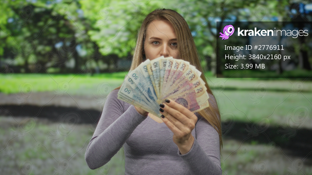 Woman holding polish zloty banknotes in a green park setting, showcasing wealth and financial success outdoors with a focused expression on her young face. - Kraken Images