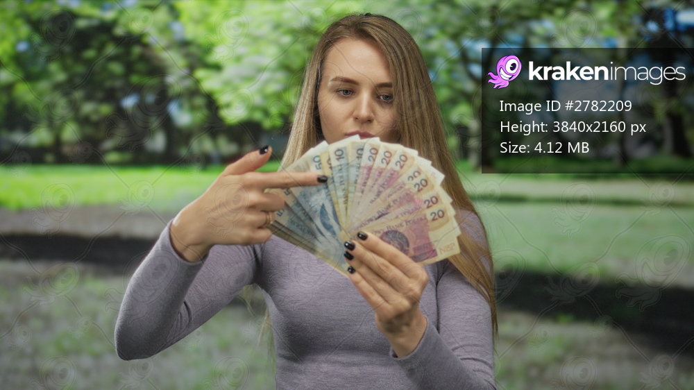 Woman holding polish zloty banknotes in a green park setting, showcasing wealth and financial success outdoors with a focused expression on her young face. - Kraken Images