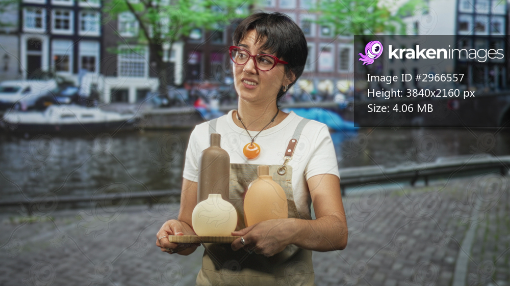Woman holding pottery vases on a tray, hands visible, wearing apron and red glasses on a street by a canal with buildings; craft pride.