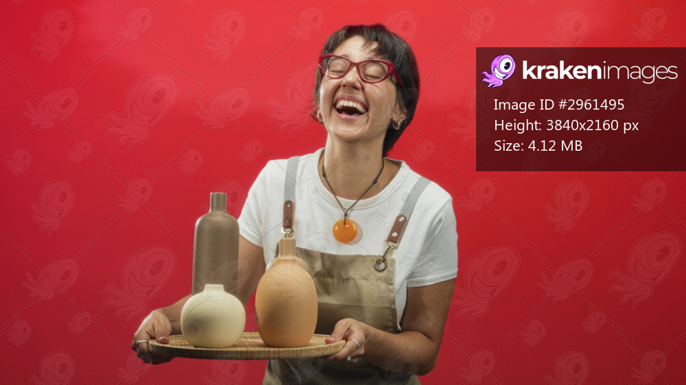 Woman holding pottery vases on a wooden tray with both hands, smiling and presenting the ceramics in studio; joy creativity.