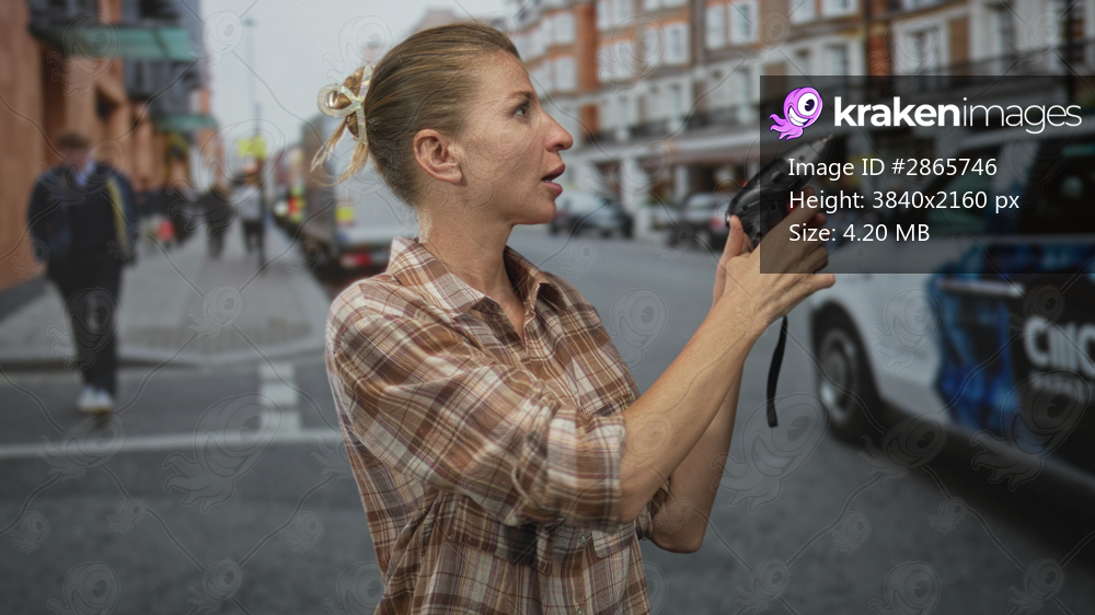 Woman holding power drill with raised hands above head on a busy city street adjusting the tool and working on task; determination repair.