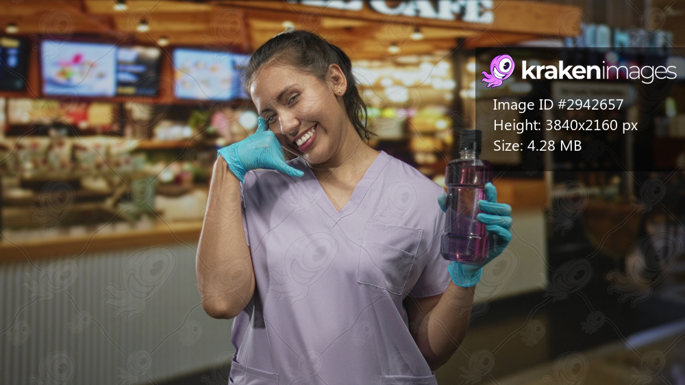 Woman holding purple mouthwash bottle and making a call gesture in a restaurant building; cheerful care.