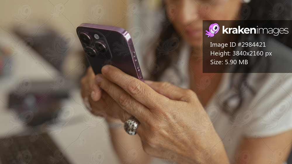 Woman holding purple smartphone, fingers tapping touchscreen at desk in building; daily routine concentration.