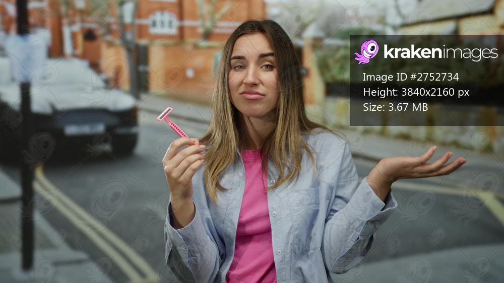 Woman holding razor outdoor street confused expression blonde pink shirt denim young urban daytime casual thinking pondering.