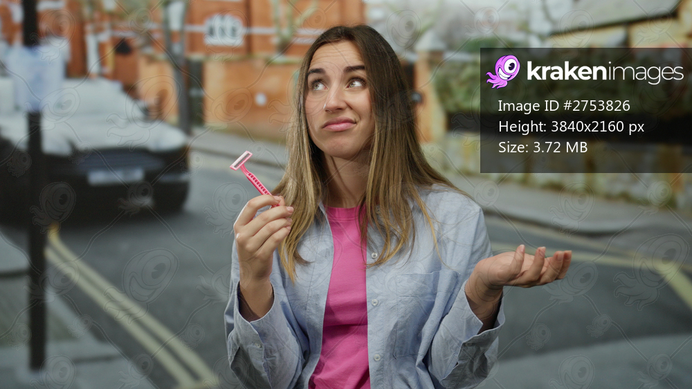 Woman holding razor outdoor street confused expression blonde pink shirt denim young urban daytime casual thinking pondering.