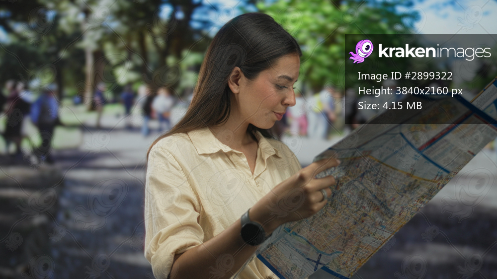 Woman holding and reading a folded map with hands on the paper in forest among trees and blurred crowd; curiosity discovery.
