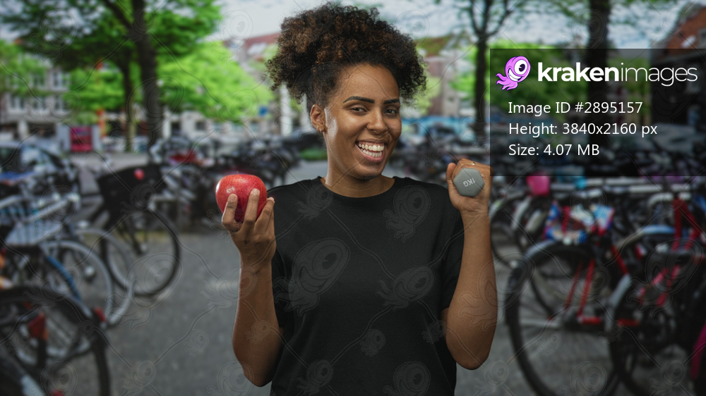 Woman holding red apple and 1kg dumbbell on street in amsterdam wearing black tshirt smiles at camera; healthy fitness joy.