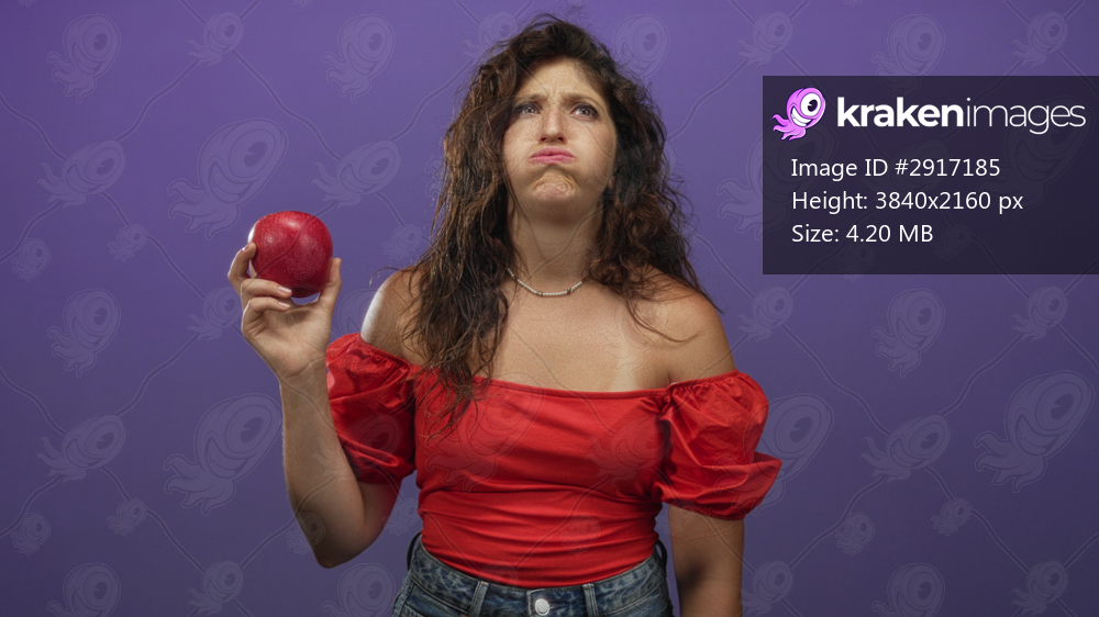Woman holding red apple at chest level with bare shoulders exposed and denim jeans against purple studio backdrop; frustration contemplation.