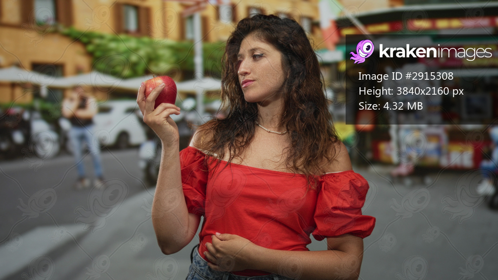 Woman holding red apple with bare shoulder visible, standing in a street market near kiosks and parked cars; contemplation health.
