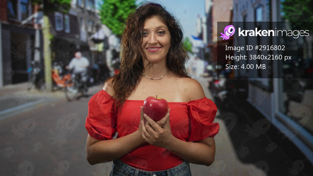 Woman holding red apple with bare shoulders on street, smiling gently and looking down; quiet contentment.