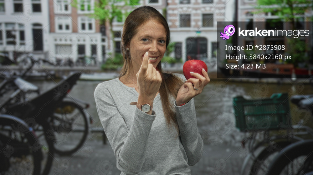 Woman holding red apple and beckoning with fingers on a street in amsterdam; playful healthy invitation.