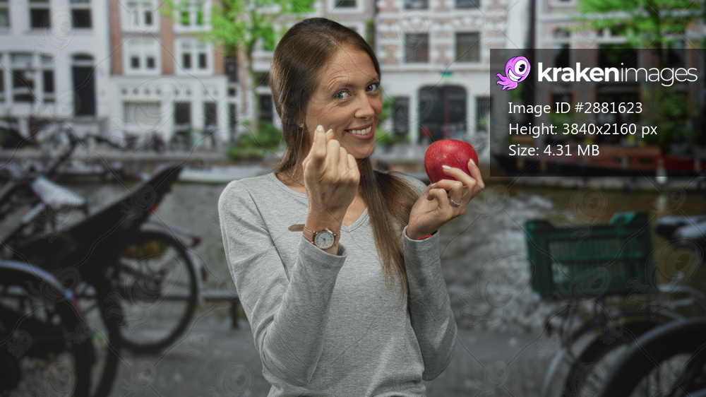 Woman holding red apple and beckoning with fingers on a street in amsterdam; playful healthy invitation.