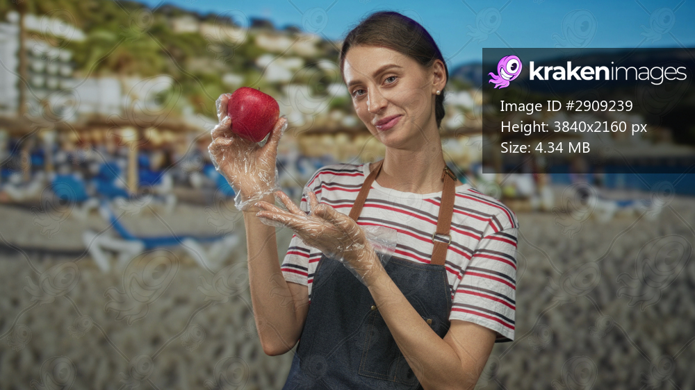 Woman holding red apple with gloved hands at beach in apron and striped shirt; fresh healthy snack friendly.