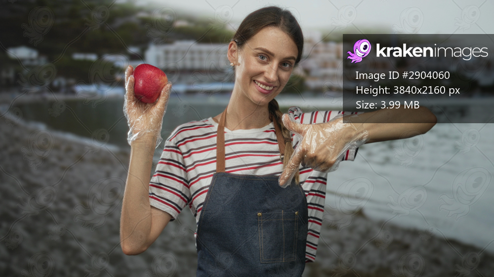 Woman holding red apple with gloved hands pointing to apple on street near seaside and beach; happiness healthy eating.
