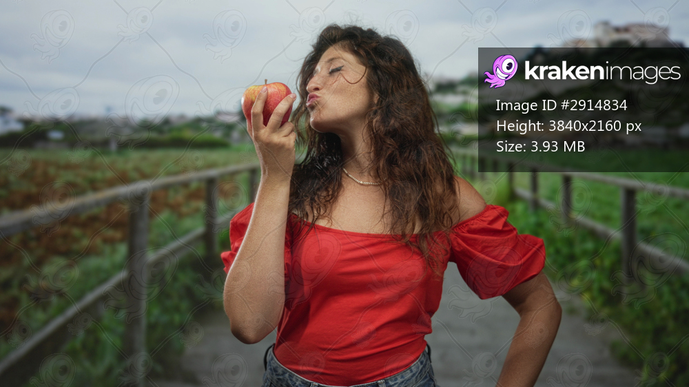 Woman holding red apple with hand lifted near face on forest path by a wooden fence in countryside; joy simplicity.