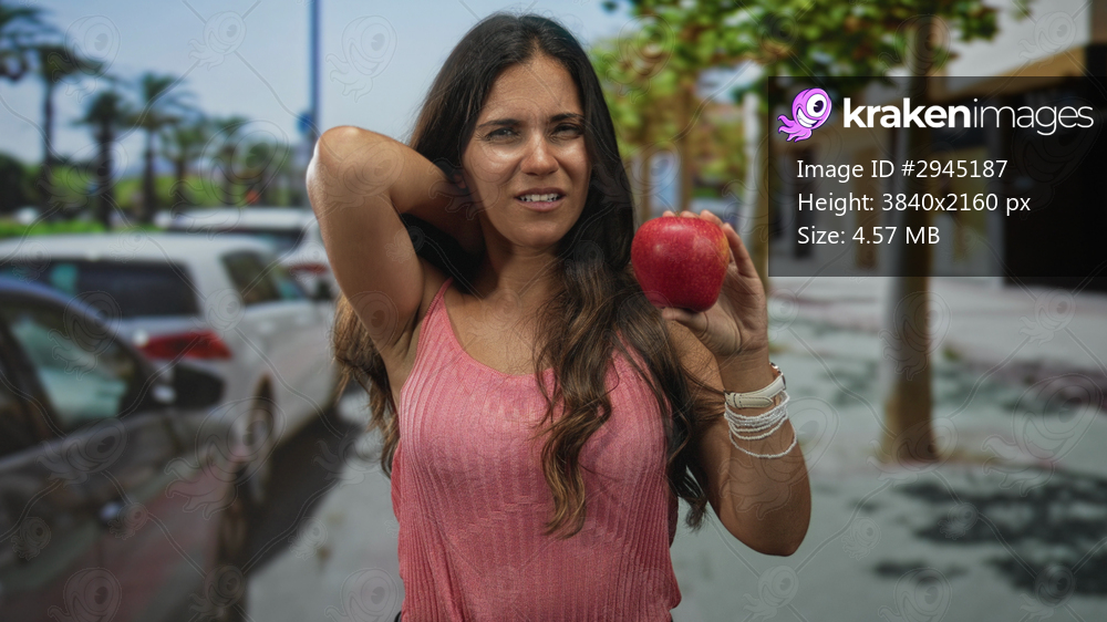 Woman holding red apple with hand on neck, eyes closed, wearing pink sleeveless shirt on city street with parked cars; discomfort.