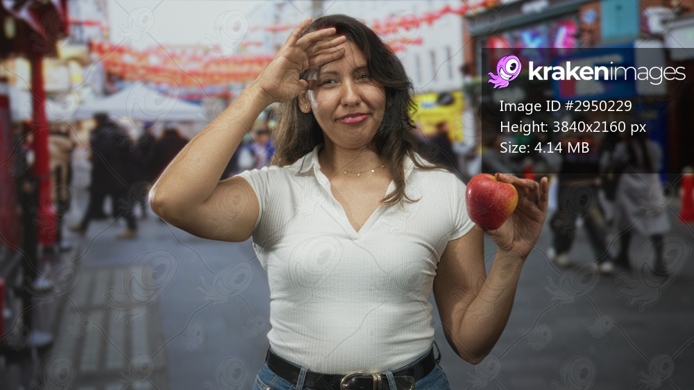 Woman holding red apple with hand to forehead on busy urban street market, white shirt, necklace and jeans visible; playful joy.
