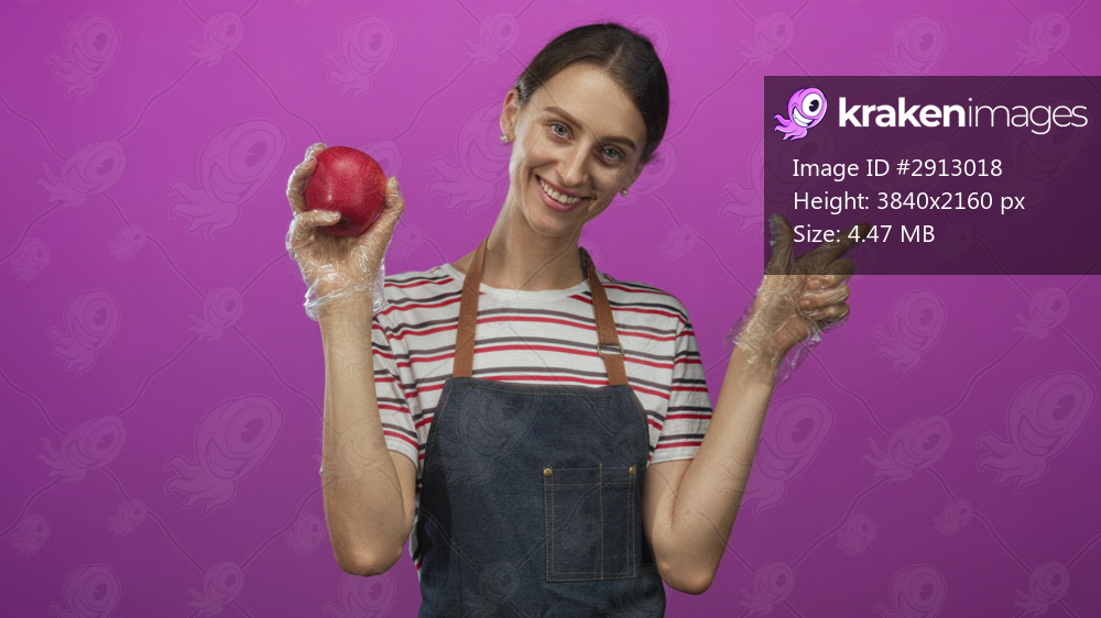 Woman holding red apple in gloved hand and pointing to the side in purple studio wearing striped shirt and denim apron; healthy eating cheerful.