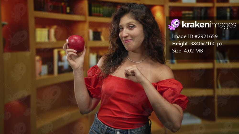 Woman holding red apple in hand with bare shoulder exposed, smiling and pointing in a library building; playful curiosity.