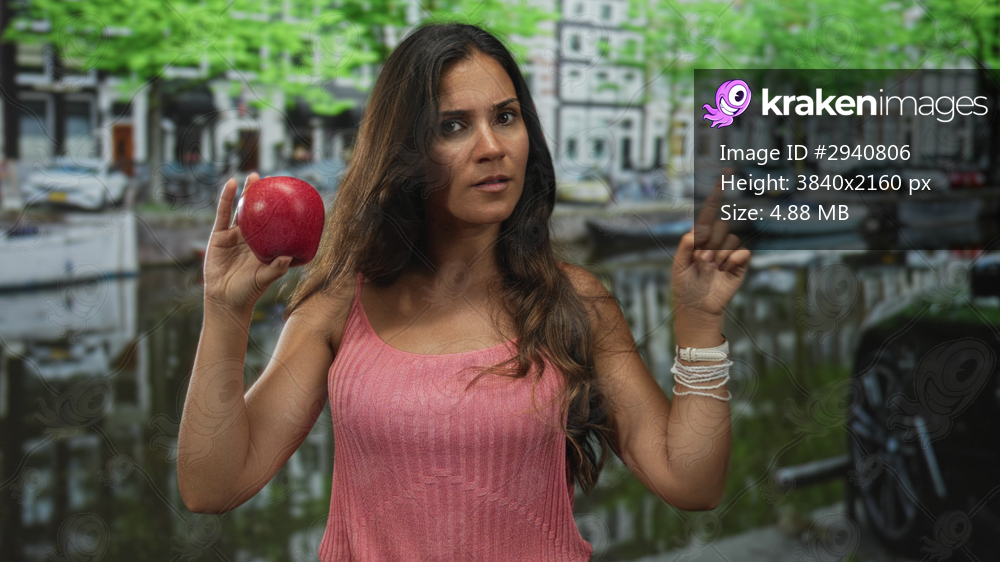 Woman holding red apple in left hand and points finger toward canal boats on street in amsterdam; curiosity healthy eating.