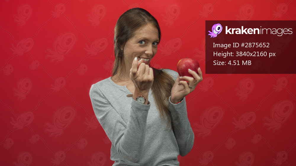 Woman holding red apple in right hand and beckoning with finger toward camera in a red studio; playful invitation.