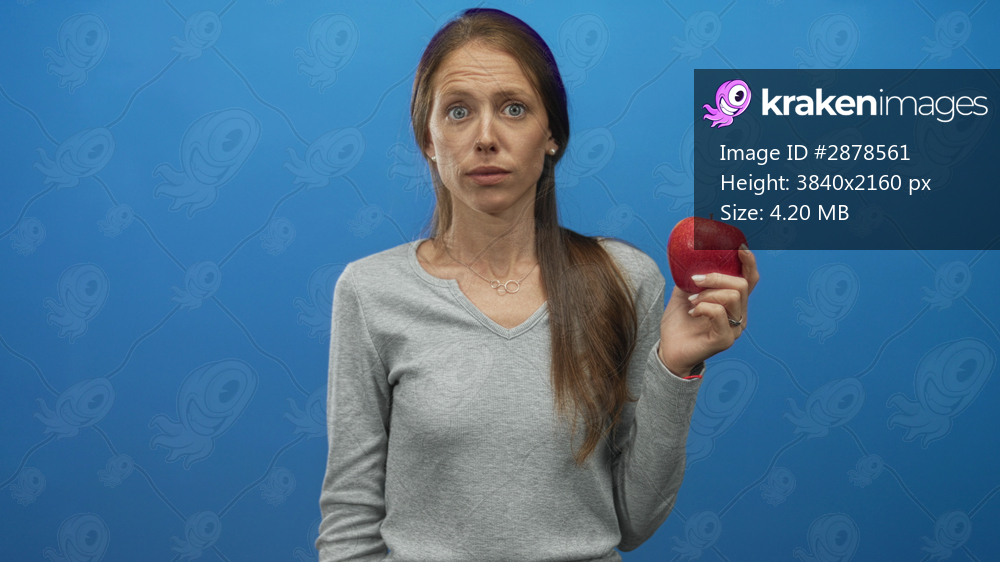 Woman holding red apple in studio with bright blue backdrop while looking to the side and gripping the fruit with her hand; thoughtful.