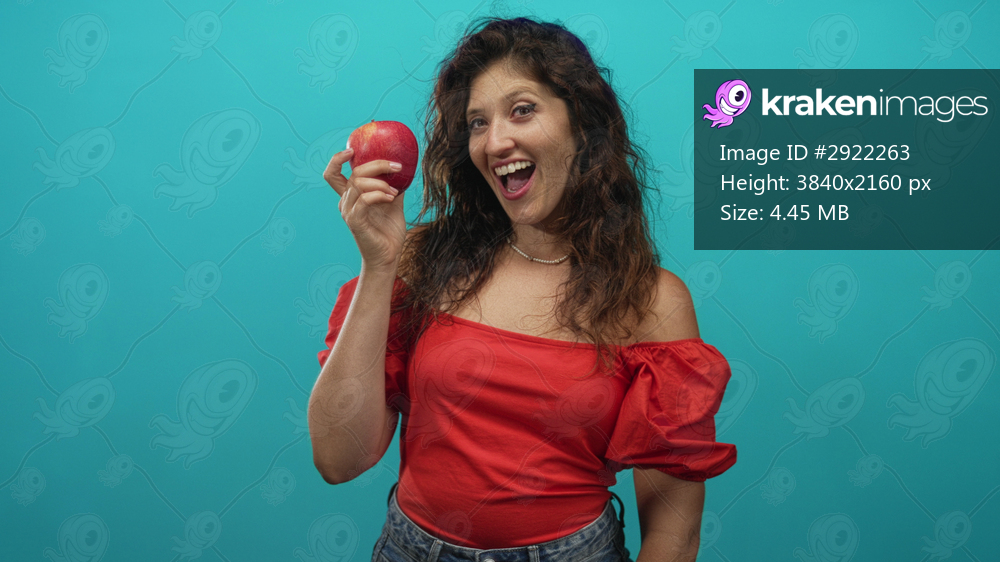 Woman holding red apple in studio turquoise, hand raised near face and smiling; playful healthy confidence.