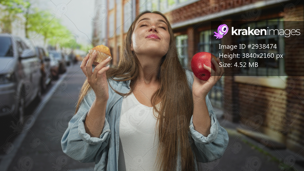 Woman holding red apple and muffin in hands on street near parked cars and brick building, eyes closed deciding between snacks; choice contentment.