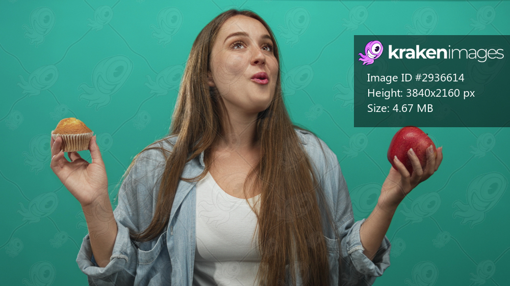 Woman holding red apple and muffin while looking aside and weighing options in teal studio; curiosity choice debate.