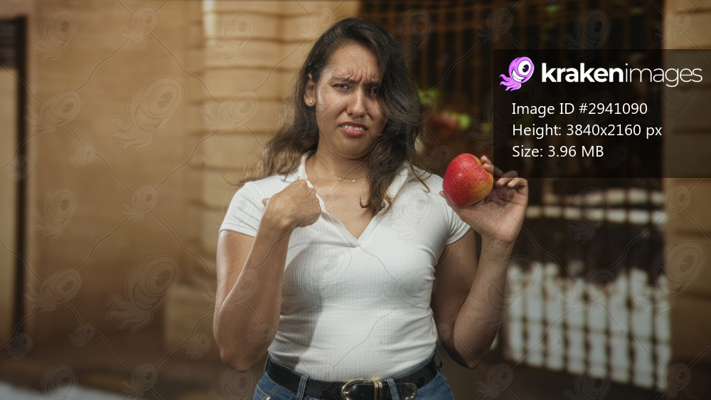 Woman holding red apple pointing finger to chest by building entrance; skepticism healthy eating choice.