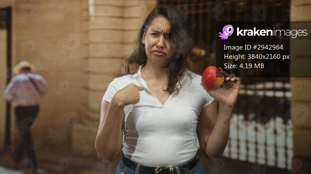 Woman holding red apple pointing finger to chest by building entrance; skepticism healthy eating choice.