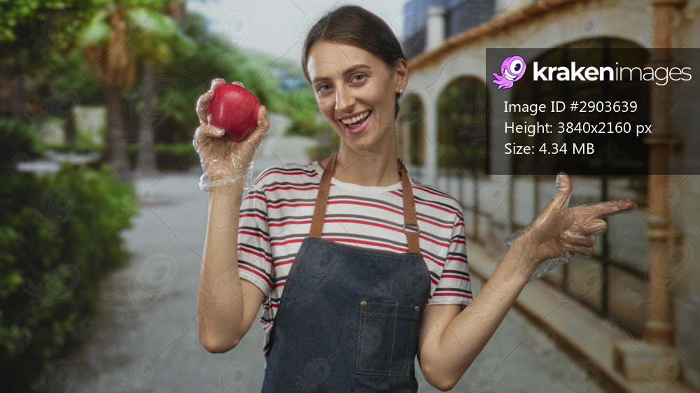 Woman holding red apple and pointing finger while wearing apron and disposable gloves in street; healthy eating cheerful.