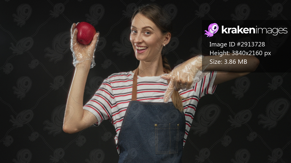 Woman holding red apple and pointing with gloved hand in studio against black backdrop; healthy snack joy.